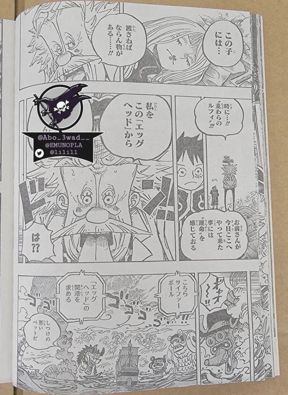 另一方面,贝加庞克和草帽一伙儿也发现了CP0的船只,草帽一伙在这里很不妙。贝加庞克(恶)提议,把海贼一伙儿交出去不就行了。