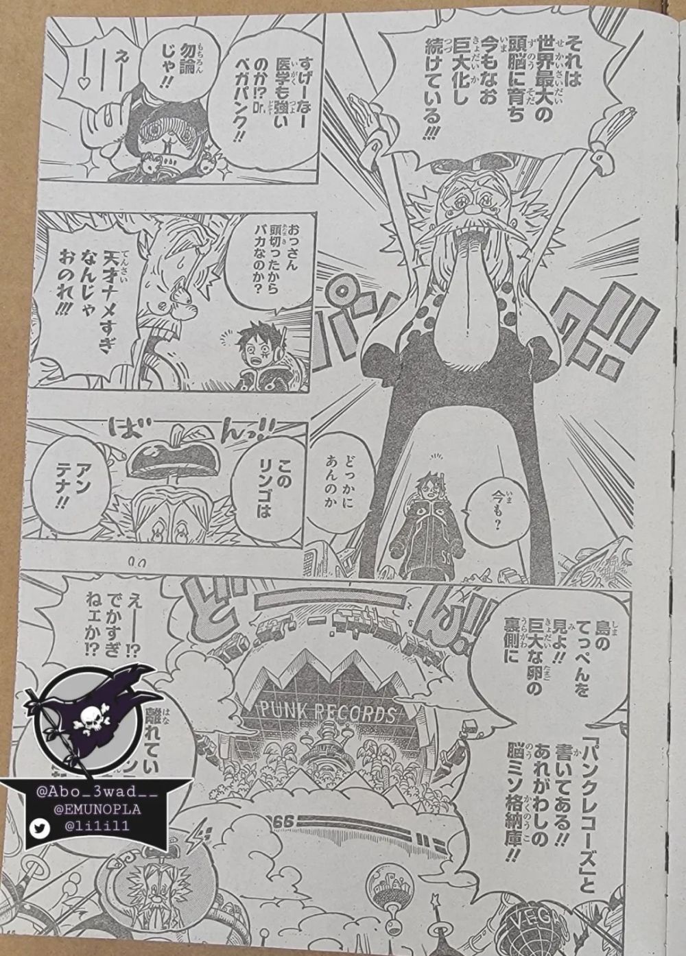 贝加庞克直接炸毛了,指着头上的物品说:这个苹果就是天线。你们看,岛屿最上方巨大蛋壳里面不是写着「庞克记忆库」几个大字,那正是老夫的脑存储仓库,就算不在这里,也能够通过无线电波进行通讯。