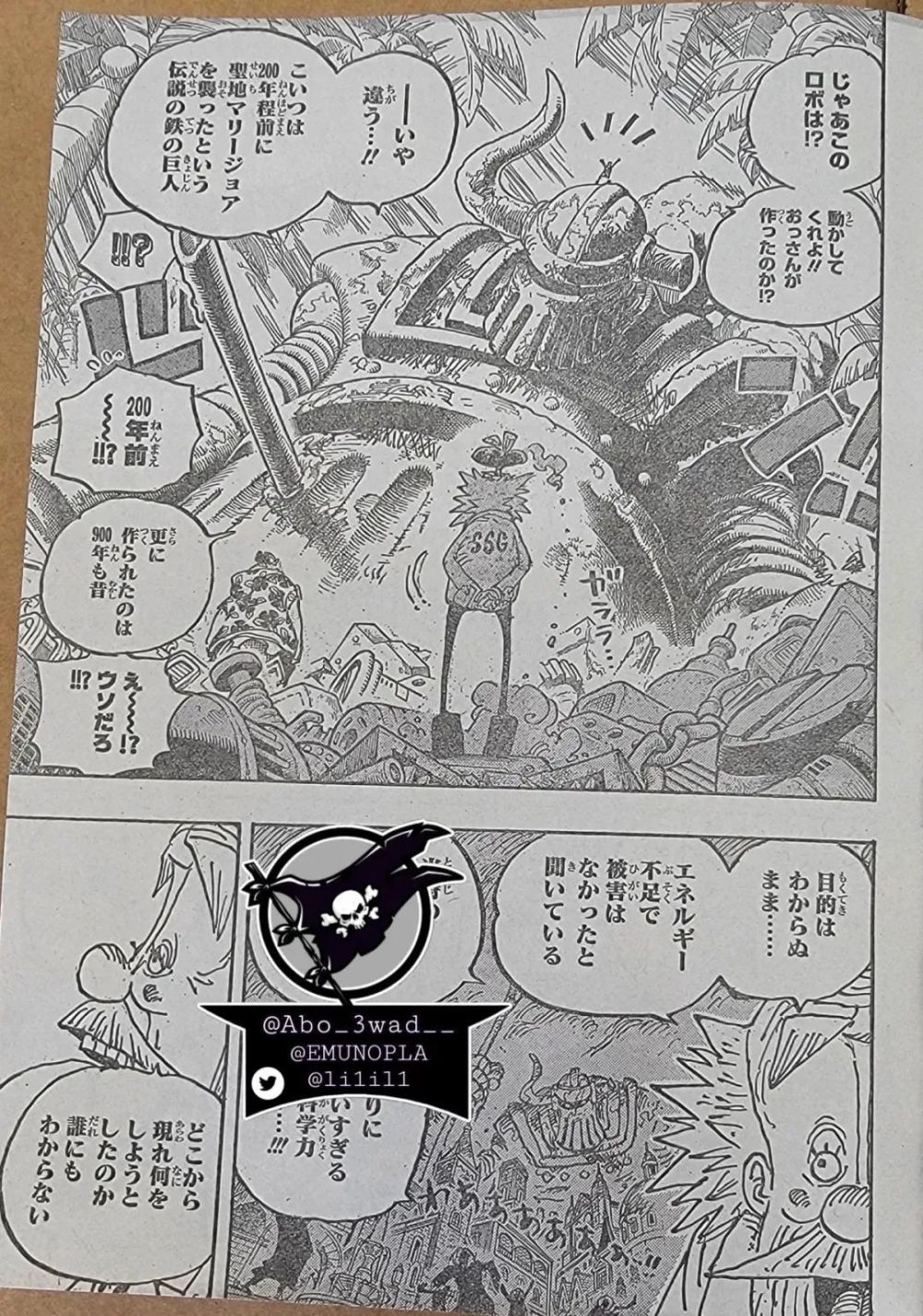 随后路飞等人又问贝加庞克能不能让这个巨大机器人动起来?贝加庞克回答那不是他制造的,这家伙是200年前袭击圣地玛丽乔亚的传说铁巨人,而且其制造年代是900年前或者更早!
