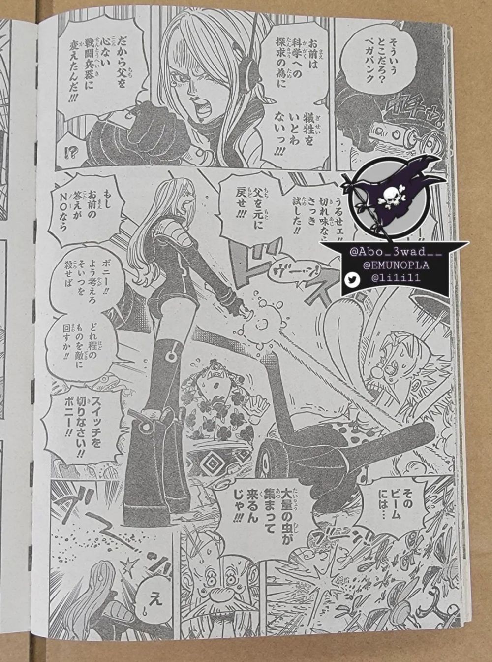 波尼开始质问贝加庞克,为了探索科学知识,根本不在乎牺牲,所以将她父亲改造成了一个没有意识的战斗机器。波尼拿出光剑,一剑将贝加庞克刺倒在地,贝加庞克连忙喊停手,这把光剑是一个失败品,会将大量虫子吸引过来。