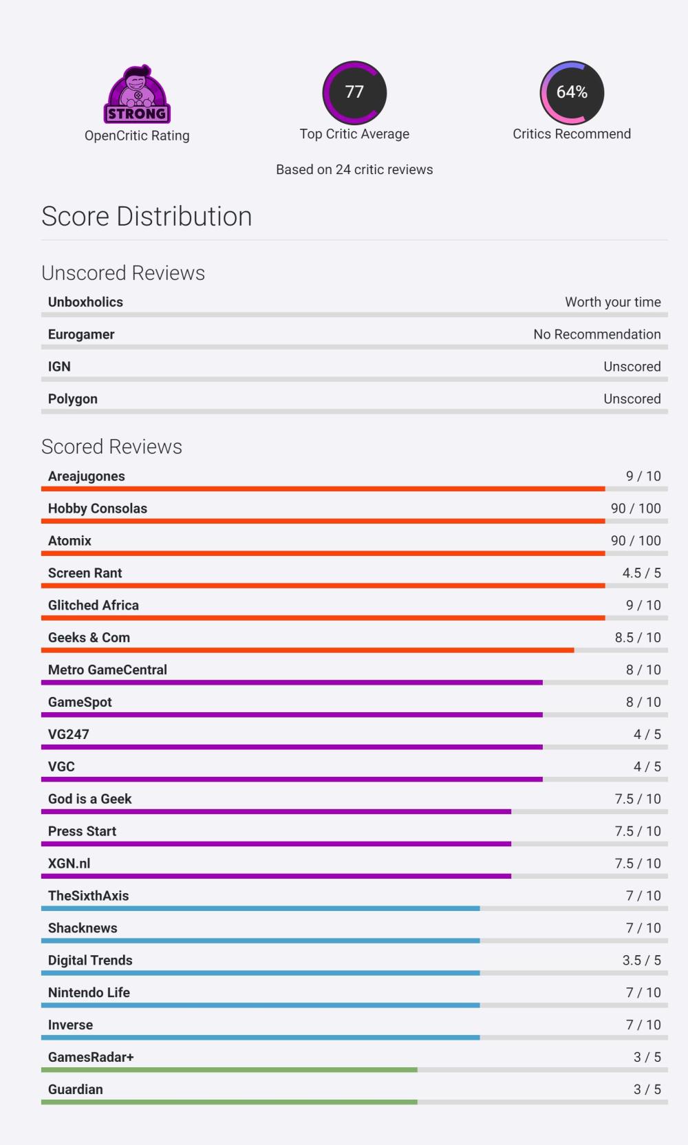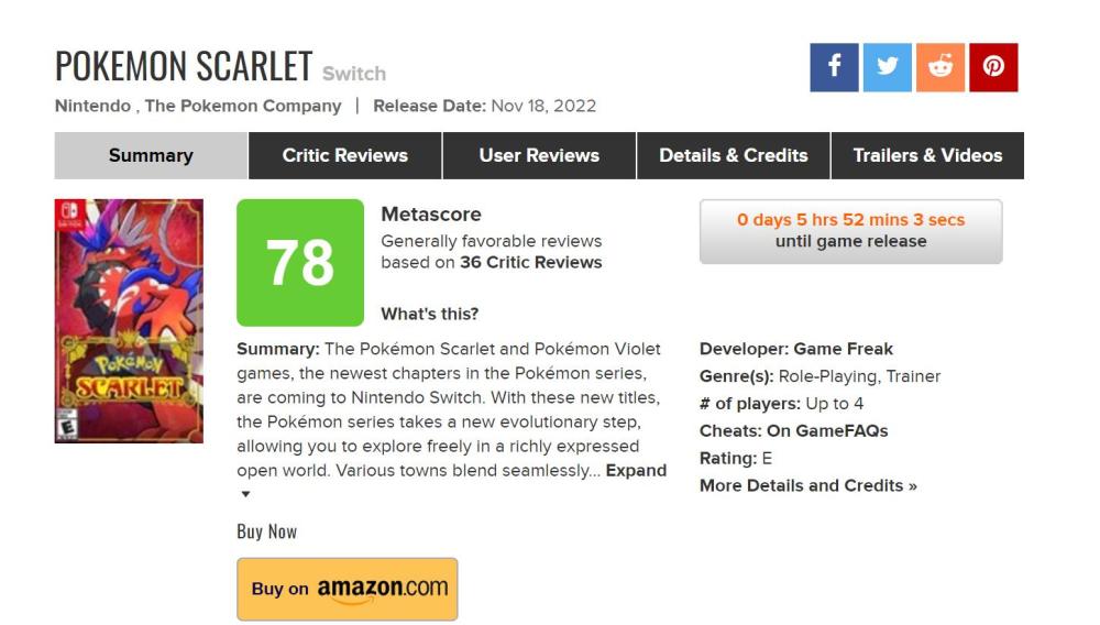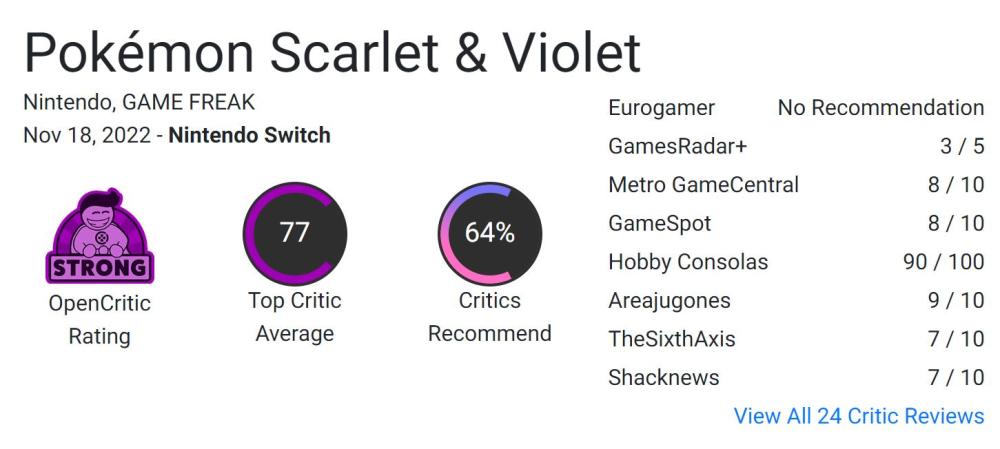 《宝可梦 朱/紫》媒体评分现已出炉。截至撰稿时,本作在 Metacritic 上共收录媒体评测 36 份(好评 25 家,中评 11 家,无差评),均分为 78 分。游戏在 Opencritic 上共收录媒体评测 24 份,均分为 77 分,推荐度 64% 。