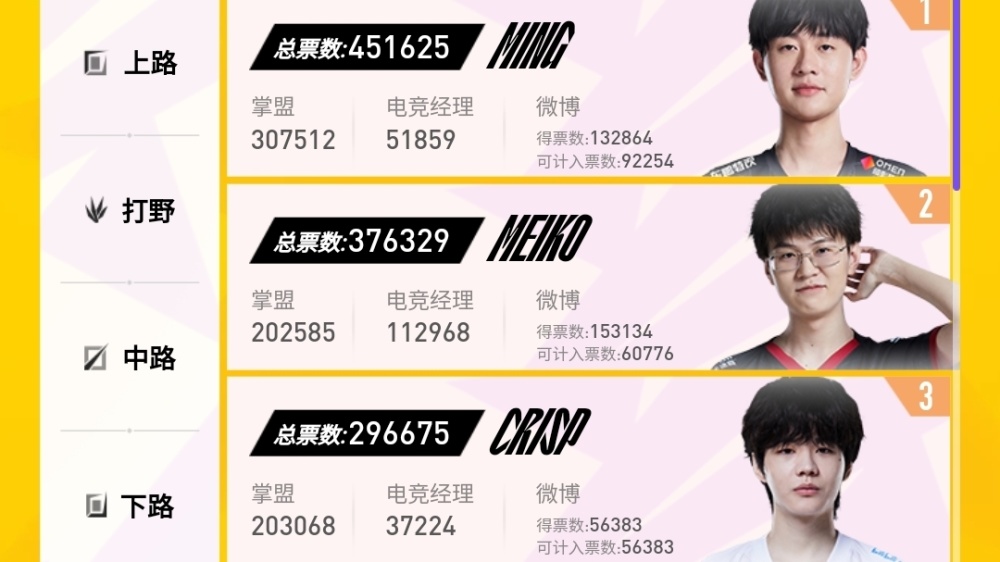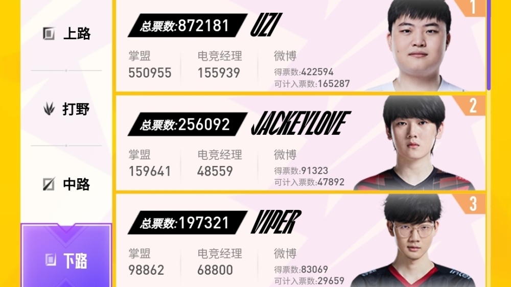 上下两路票数断崖,UZI领先JKL近60万票