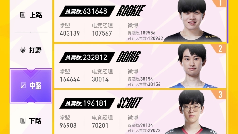 来到中路这个位置,Knight因为世界赛表现不佳,连进入前5的资格都没有,而目前位列第一的是Rookie,总票数62.6万左右,不过第二和第三直接,Doinb和Scout并没有拉开特别大的差距,两人的票数分别是23和19.4,仅有3万左右的差距,是有机会追上来的,不过Rookie领先Doinb超过39万票的情况下,进入全明星是没有任何悬念的。