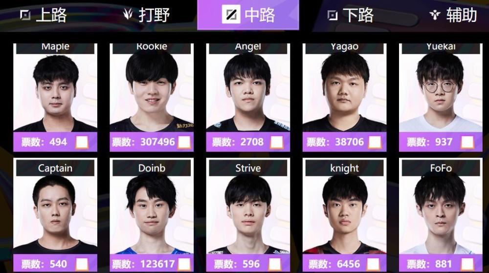 然后是中单位置,中单位置scout能拿第一小编真没想到,因为这次世界赛里他表现得并不好,他拿到第一让人惊讶,还有一个人的排名也让人惊讶,那就是左手knight,让人惊讶的是中单排名的前三名里居然没有他,他一直被誉为国产中单的标杆,结果居然排不进前三,看来之前的负面新闻影响还挺大的。