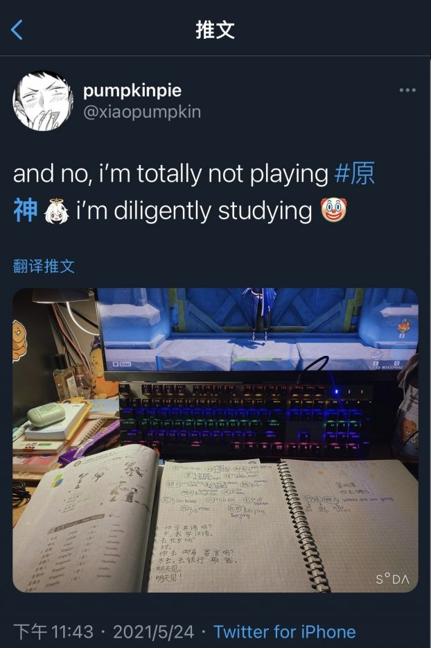 久而久之,老外们也发现了学好中文的重要性——只有学好中文,才能玩好原神。推特上一位名叫“pumpkinpie”(南瓜饼)的玩家,就晒出了自己学习汉语拼音的照片,电脑上还显示着原神的游戏画面。这名老外还配文说:“不,我才没在玩原神,我在认真学习呢!”