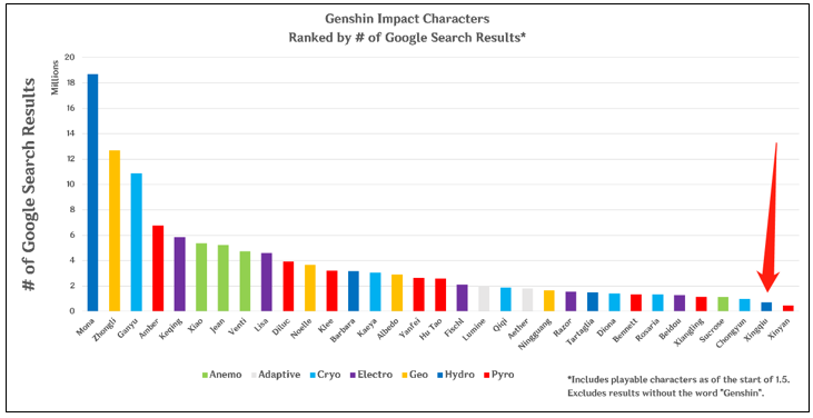 其实,像这名《原神》玩家一样用功学汉语的老外玩家真的不在少数。之前有玩家统计了统计并发布了《原神角色谷歌搜索结果量排行榜》,前三名分别是莫娜、钟离、甘雨。但老外们根本不关心莫娜的搜索量是怎么高过钟离的,老外们反而纷纷在给行秋道歉!