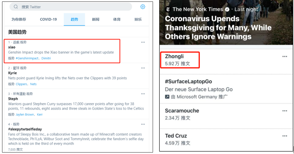 《原神》是一款业界罕见的全球同步运营节奏、跨多个平台的游戏,不仅在国内大火,在全球多个国家都掀起了一阵热潮。zhongli、ganyu、xiao等热门角色的汉语拼音名,曾多次登上外国版微博——推特的热搜榜单,成为海外全民热议话题。