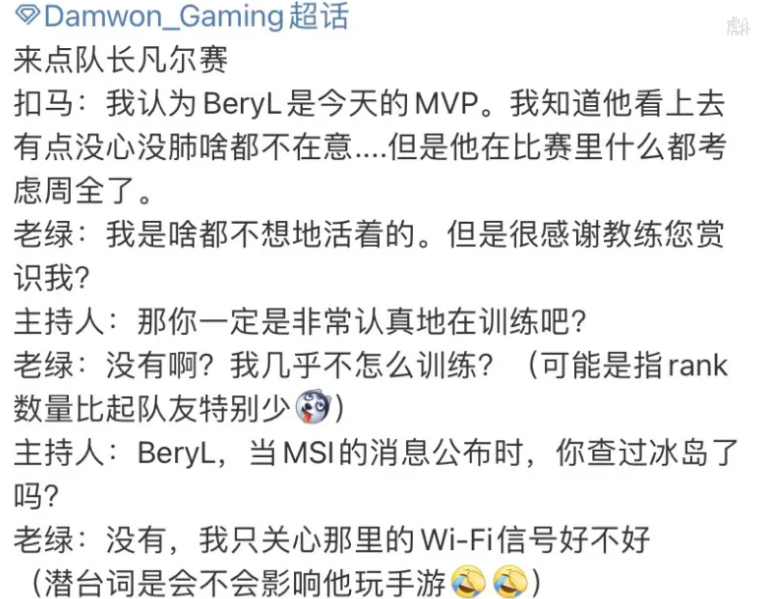 而在MSI决赛赛后,BeryL被网友爆出在比赛前仍然还在玩原神,从而立刻遭到了韩国网友的爆破,对国内网友来说这乐子实在是太大了,遂直接造成了此次的造梗狂潮。
