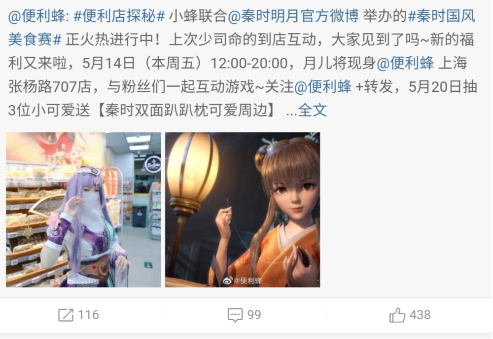 二次元和实体店联动,早在十年前《喜羊羊与灰太狼》就实现过,六年前《全职高手》也和肯德基联动过一番,但真正让二次元和实体店形成热潮,还得看今年年初《原神》和肯德基的联动。《原神》和实体店的联动,吸引了大批coser到店里光顾,coser又带来了一批粉丝。《秦时明月》可能学习了《原神》的这番操作,请了几个coser到便利蜂。以后肯定还会有越来越多的二次元ip,进行这种二次元+coser+实体店的尝试。