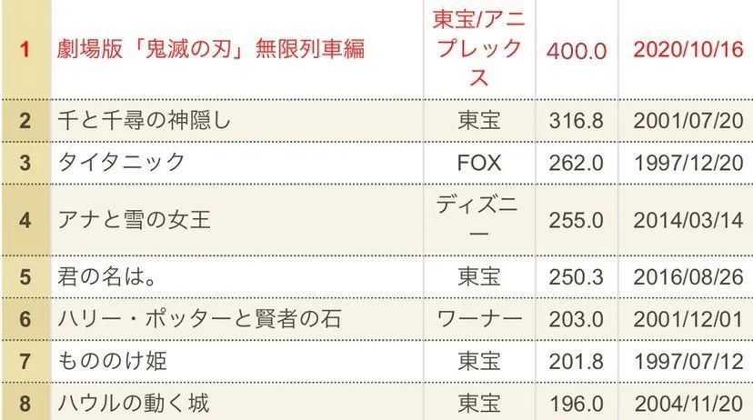 《鬼灭之刃 无限列车篇》剧场版日本电影票房——正式突破400亿日元!