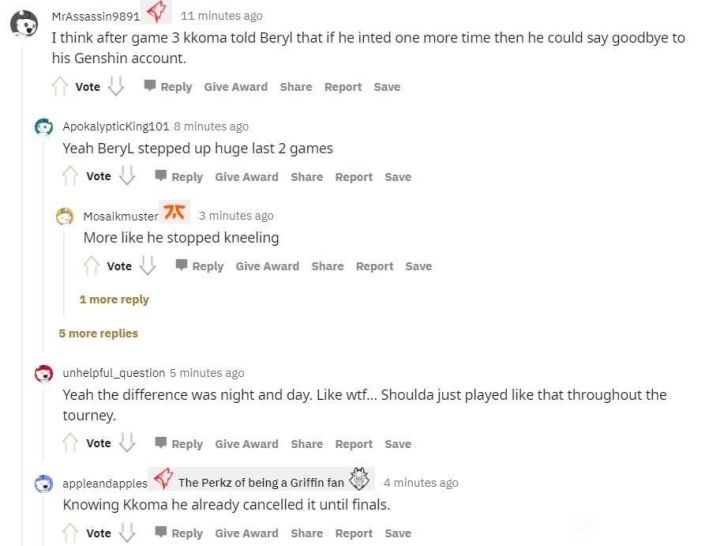 甚至这场比赛还留下了一个梗:RNG的胜利,牛宝去FPX占了三分之一的功劳、A出的那一斧子占了三分之一的功劳、原神占了三分之一的功劳。现在Beryl被大家亲切的称呼为be ryl。