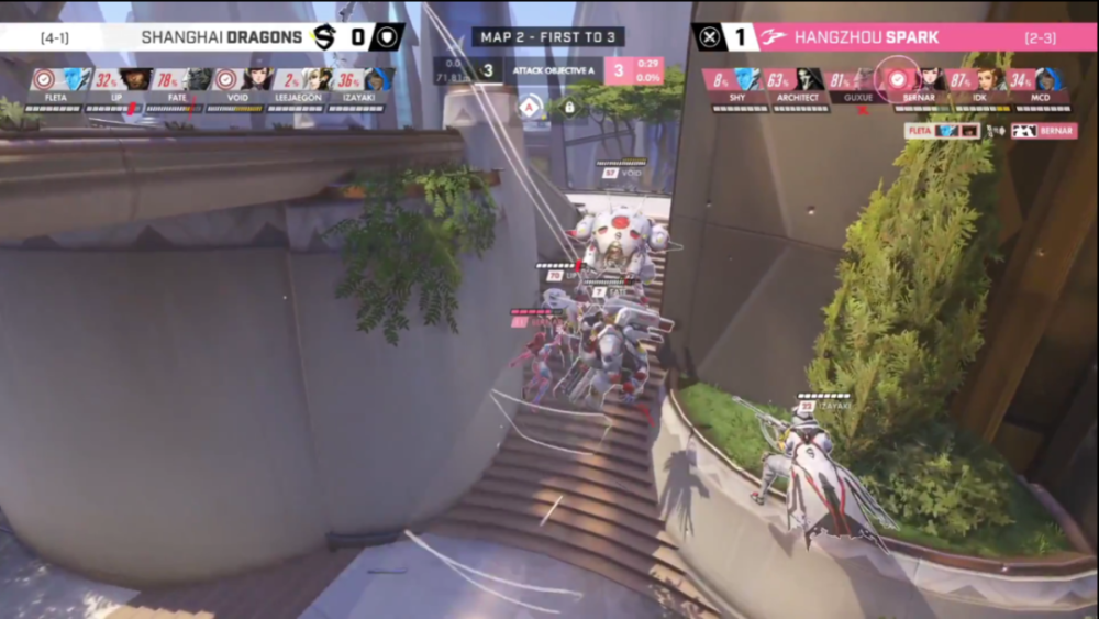 周六凌晨西部赛区的两场比赛波澜不惊,多伦多捍卫者队和佛罗里达狂欢队顺利击败两支欧洲兄弟队伍,然而之后进行的数次对抗,比赛的过程和结果逐渐变得难以预料。周六下午来到东部赛区,广州冲锋队迎战最近状态急速回暖的杭州闪电队。两支队伍为了六月赛程都拿出了精心准备过的战术阵容,闪电队方面Shy在前段时间苦练回声所付出的汗水,在本场比赛得到了颇丰的回报。两队在奇招相互试探后进入到全面进攻,ChoiSehwan在无法使用猎空的情况下,拿出士兵:76与Eileen完成双C位轮流发力的攻势,闪电队在先丢一分局势下开始发力,Shy弹无虚发不断消灭冲锋队的进攻点,帮助队伍不断积累优势。ChoiSehwan在后半程也拿出回声试图阻击Shy,但是多次进攻无果闪电队在整体进攻方面略胜一筹,比赛终盘比分锁定在3:1,闪电队取得胜利。