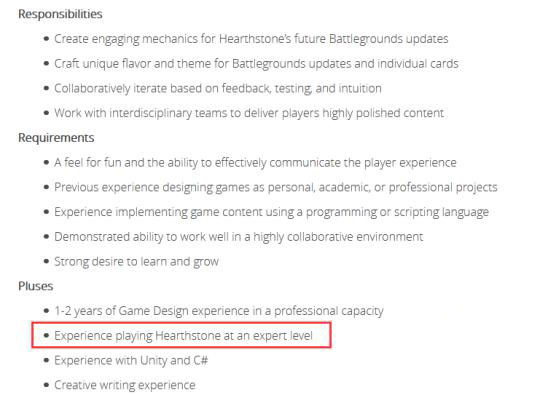 根据暴雪发布的招聘信息,应聘者需要对《炉石传说》有极深的理解,而且必须是个服务器排名前百的高手。除此之外,还需要应聘者拥有至少一到两年的游戏设计经验,精通Unity和C#编程语言,还要拥有创意写作的经验。