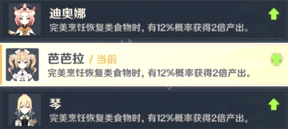 恢复类(完美烹饪该类食物,12%双倍产出):芭芭拉、迪奥娜、琴。