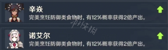 防御类(完美烹饪该类食物,12%双倍产出):诺艾尔、辛焱。