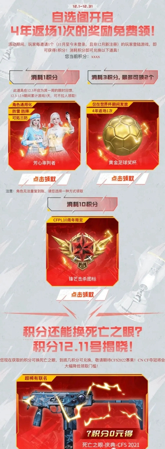 今年cf也迎来了非常重大的活动,在12月将会开启cf黄金足球奖杯领取活动,在活动中玩家可以登录活动页面领取非常多的活动奖励,下面小编就整理了一下奖励,可以免费的领取到破茧系列的皮肤。