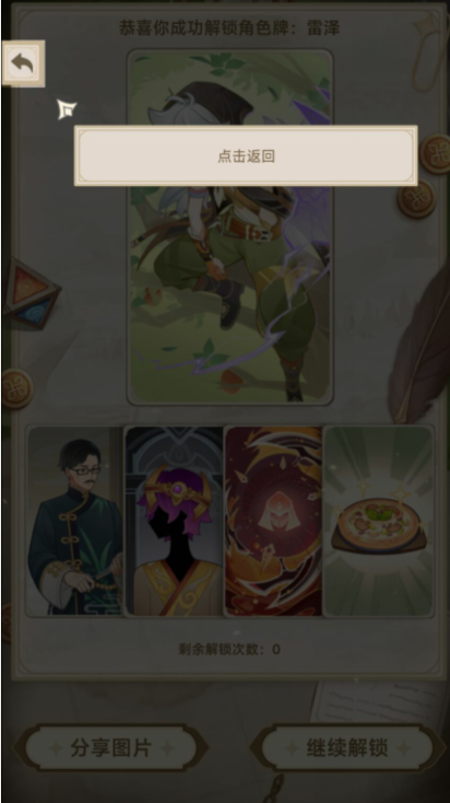 6、本次解锁雷泽卡牌。可以继续解锁也可以返回。