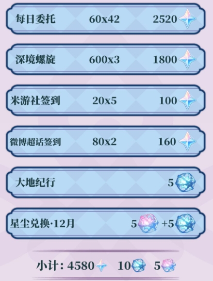 1、大小月卡党可获得13080原石10蓝球9粉球 折合91纠缠。