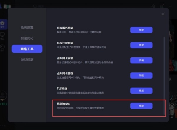7、玩家可以在加 速器内打开设置选择网络工具点击修复ho sts,来修复文件。