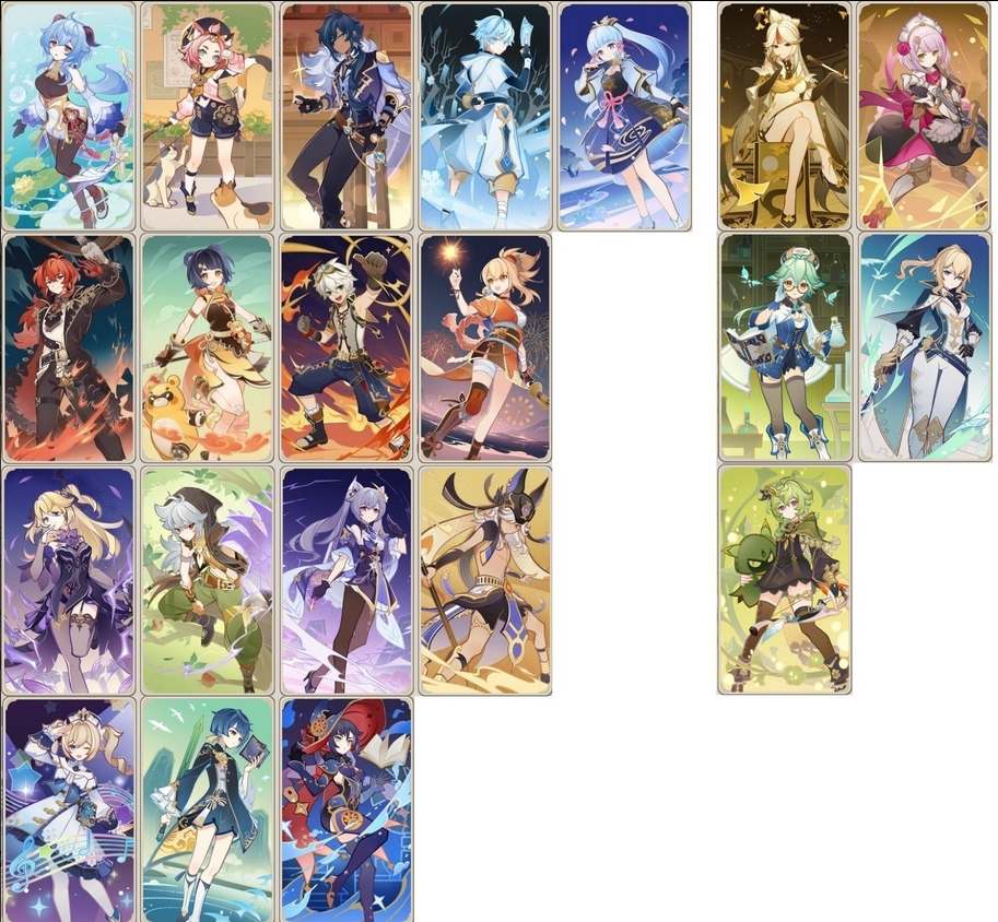 1、T1角色牌香菱、甘雨、柯莱、雷泽、岩属性丘丘王、冬国仕女、债务处理人、翠翎恐蕈;