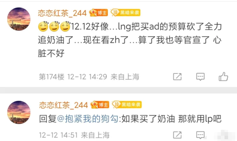 没想到的是,网友担心的情况似乎逐渐变为现实,迟迟没有做出选择的Doinb被认为最大可能是新赛季会留在LNG跟老东家续约。然而在12月12日当天,LPL转会期知名爆料人恋恋红茶却突然发博爆料,透露LNG好像把买AD的预算砍了,全力追求OMG的中单小奶油。