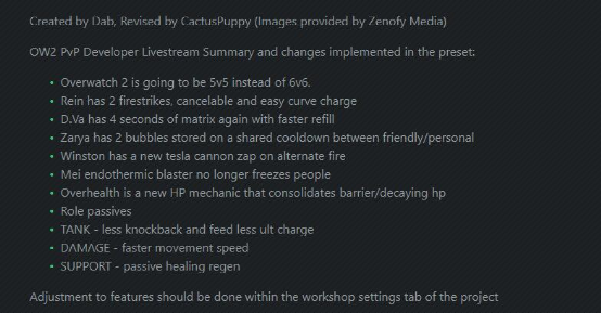 比如,这个工坊设定与《守望先锋2》一样,都是采用的5V5设计,大锤莱因哈特将会有两发烈焰打击,可以取消并轻松进行弯道冲锋,dva有4秒的矩阵,毛妹可以储存两个护盾,温斯顿的远程攻击也坐了进去,坦克、输出、辅助位的独特被动也加入到游戏当中。