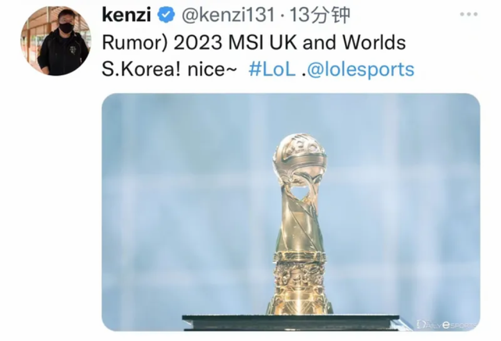 根据韩媒电竞记者Kenzi发文爆料,2023年英雄联盟季中冠军赛将于英国举办,至于S13世界赛则将会放在韩国。结合更早前外媒Esports News UK爆料的内容,不出意外2023年MSI将会在英国首都伦敦举办,而这也会是英国首次举办MSI赛事。