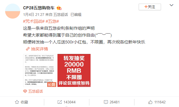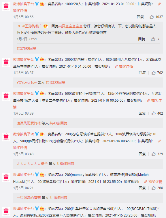最出圈的一次吵架,是年初《咒回》中某一cp产粮组为明志而设置的转发抽奖博,由于过于豪气,过于丰富阔绰,招至14万转发扩散,热评区奖品备案连翻五页翻不完,且转发区不少粉丝不断加码,总价值超过5万。走过路过,前来围观的朋友们直呼果然是热圈,给的实在是,太多了。