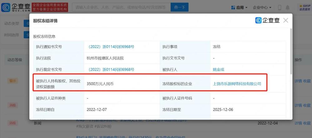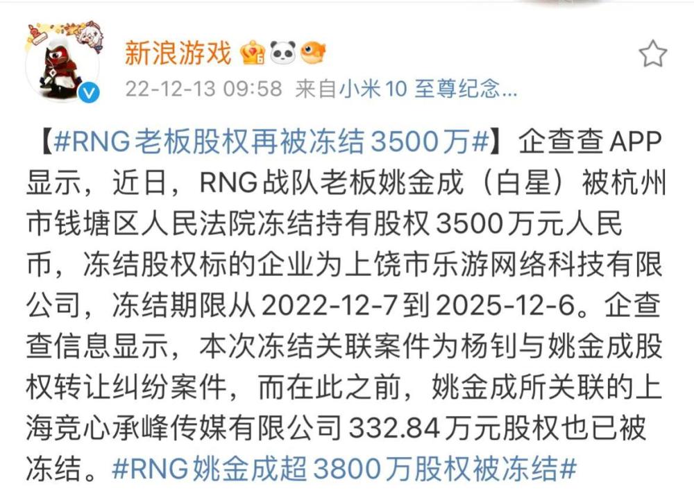 RNG战队老板姚金成(白星)被杭州市钱塘区人民法院冻结持有股权3500万元人民币,冻结股权标的企业为上饶市乐游网络科技有限公司,冻结期限从2022-12-7到2025-12-6。企查查信息显示,本次冻结关联案件为杨钊与姚金成股权转让纠纷案件,而在此之前,姚金成所关联的上海竞心承峰传媒有限公司332.84万元股权也已被冻结。大量的玩家在得知这个事情之后,也是拍手叫好,毕竟他们所做的种种事情,真的让玩家们都无法接受,各种竞价合同以及商业合同让很多的选手都无法施展自己的才华。