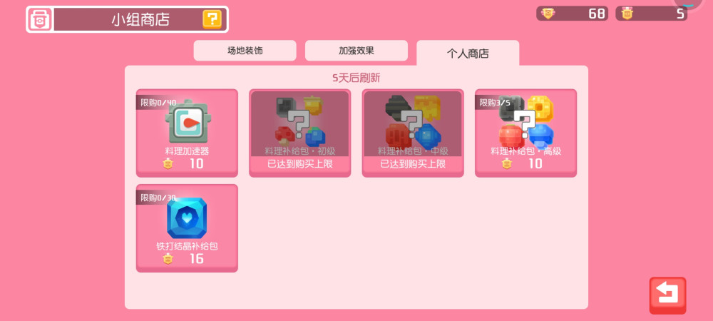 玩家加入一个小组之后,可以看到里面有商店,商店中能购买三种食材礼包,分别为初级、中级和高级,每一种都限定了购买次数。玩家每天完成小组订单任务,可以获得协力之证,这个可以用来购买商店中的食材礼包,非常简单。