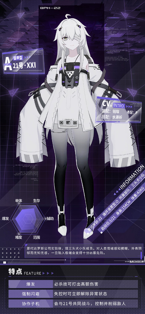 在这次版本中,全新构造体21号将正式落地!作为A级装甲型构造体的她,浑身纯白,身躯娇小的她,却有着不容小觑的强大力量。在黑野的一次任务中被作为任务目标带出,被黑野归入麾下,后与薇拉组成三头犬小队。对人类情绪感知模糊,外表阴郁而无知无感,一旦陷入极端会变得十分凶狠危险。
