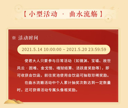 在本次“曲水流觞”活动期间,各位玩家“使君”要参与日常活动,即可获取“会饮函”,如通关故世风云普通、故世风云困难、宝墟、仙喵指路副本,魂狱每日结算,参加金戈演武、沙盘演略战斗并取胜,活跃度达到100,奇遇/支线剧情任务,喵游园等。