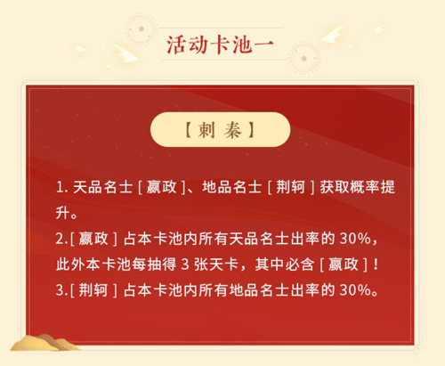 在本卡池中,天品名士嬴政与地品名士荆轲的获取概率大大提升!各位“使君”可在此卡池中使用喵灵偶进行寻英,与二位名士相遇,共战忘川!