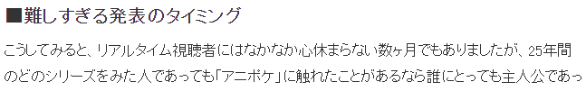 究竟什么时候公布这个消息呢?想必官方经过了艰难的研究考虑,既不能太早,在训练师大赛热火朝天之际突然给粉丝泼凉水?显然太败人品,然而在更换前一周公布的话,实在太过突然显得仓促不周,于是乎考虑在距离更换主角还有近一个月的时间点公布消息,或许可以留给粉丝们足够的时间去温存、感怀过去与小智们一起走过的经历。