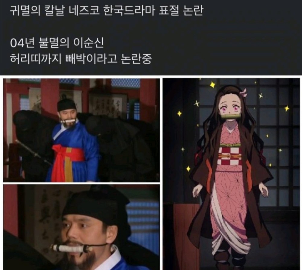 偷国人扒出了2004年韩剧《不灭的李舜臣》里的一个刺客形象,他们发现这个刺客在行刺的时候,为了不发出奇怪的声响,嘴里咬着一个竹筒,刚刚好祢豆子的嘴巴也咬着一个竹筒,这次意外撞车就让一些偷国人怒了,他们纷纷指责祢豆子剽窃了韩国的传统文化,认为嘴里含着硬棒子是他们偷国的专利。偷国人这一闹自家的热搜没上,反倒上了日本的热搜。
