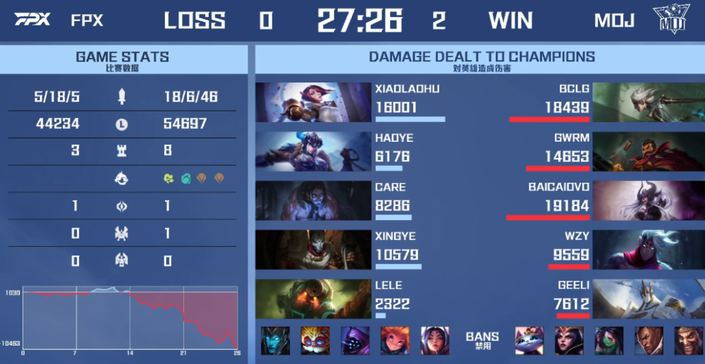 而再从比赛的整个过程来看,如果FPX是以比较小的劣势而输掉比赛,因为新阵容需要磨合倒还能理解。但是这连续的两场比赛几乎都是在25分钟左右的时候结束,不管是对线期还是团战期,MOJ可以说是对FPX打出了完美的压制。特别是上单比较有赛事经验的Xiaolaohu更是在比赛中出现了屡次被“单杀”的情况,而出现这样一边倒比赛也着实让不少网友们感到震惊。
