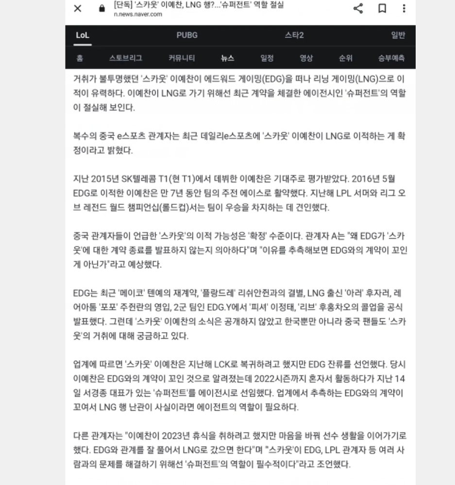 在说EDG消息之前先说一下Kenzi爆料人,因为他是韩网爆料人所以很多LPL观众不了解他,其实他的爆料不仅准而且快,Kenzi成名之战就是RNG-阿水,他是最先爆料这个消息的,其次Viper确定加入EDG也是他爆料的,除此之外还有很多大家觉得不可思议的最后被证实的消息他都爆料过,Kenzi近日突然发文说了一段话,因为语言不通只能通过机翻,有些原话肯定翻译不出来但大体意思还是能知道的,内容如下:曾去向不明的小学弟很大可能离开EDG去LNG,可以看出他前段时间签约的Supergent代理人很有用。