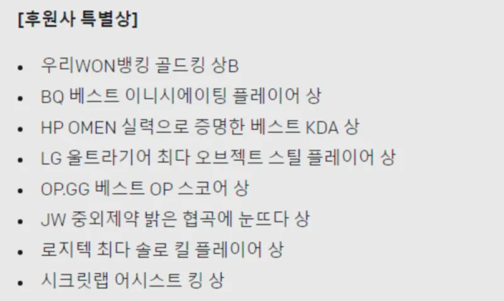 赞助商特别奖,这是LCK很独特的一个奖项设置,就是今年赞助LCK联赛的一些赞助商设定的奖项,比如今年的友利银行Gold King、BBQ的最佳开团、惠普OMEN用实力证明的最佳KDA奖、LG抢地图资源次数最多奖、PG.GG最佳OP分数奖、JW闪耀峡谷奖、罗技单杀次数最多奖、secretlab助攻King。