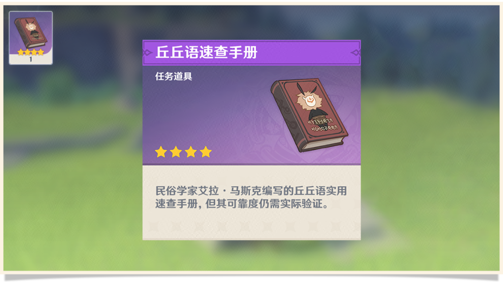 关于这次活动的核心通关攻略还是来源于一本叫做【丘丘语速查手册】的任务道具。通过这个道具,咱们能够翻译线索里面的一些关键信息。通过关键信息大家能够找到具体的定位。这次的目标地点一共有7个,也就是说咱们一共能够获得420原石,这个奖励虽然看起来不多,但是有句话叫做积少成多嘛。