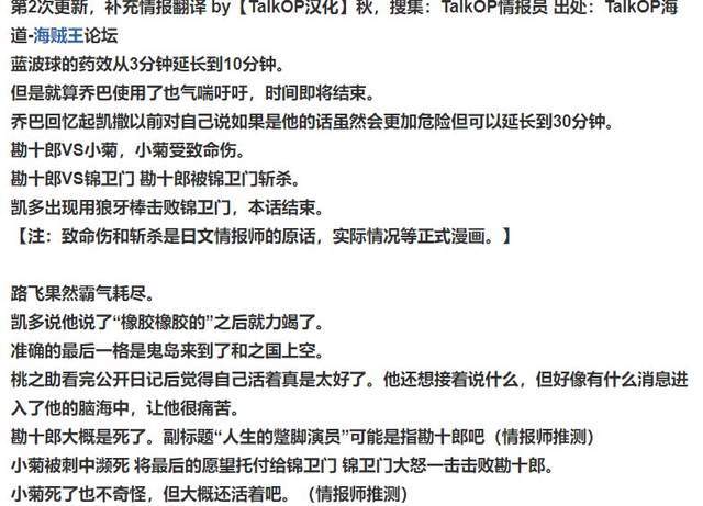 其次是路飞筋疲力尽落海的消息,路飞筋疲力尽的消息是凯多放出来的,那么可信度应该很高,但是路飞落海之后的剧情,在下一话出来之前,可以让大家尽情想象了,比如被赶来的其他人救了,或者一只暗淡无光的山治救了,又或者遇到什么神奇的人物给救了等等。