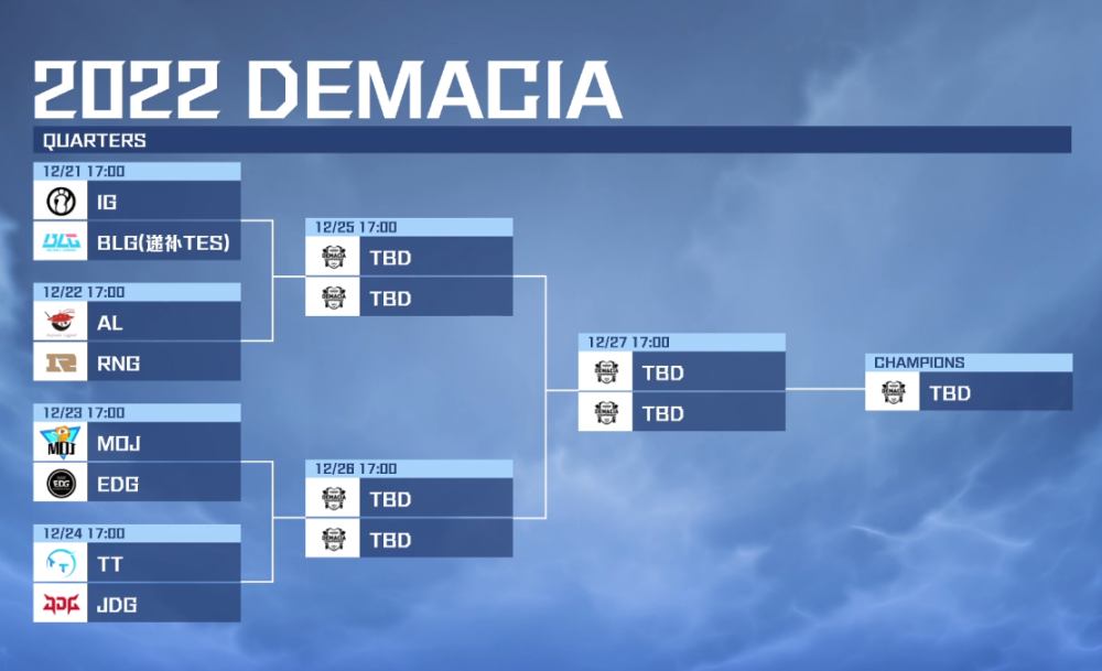 2022年12月20日,德玛西亚杯迎来了BLG与TT的对决。值得一提的是,BLG与TT一样,为了能够尽早调整状态并为新赛季准备,两支队伍都是派出了首发。特别是BLG的新阵容,因为在上一场比赛打出了碾压的表现,不少人还是看好BLG能够轻松击败TT的。但没想到的是,最终,TT以2-1的总比分成功击败了BLG。不过,BLG虽然不敌TT,但TES因选手身体不适而退出了德玛西亚杯,所以BLG则被成功“复活”顶替TES的位置。至此,2022德玛西亚杯八强名单与对阵已经全部出炉。