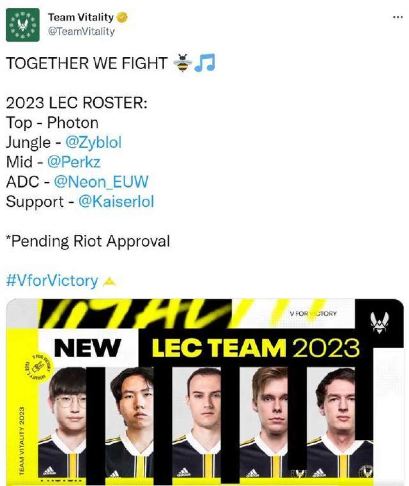 2022赛季临近尾声,随着新赛季的版本上线以及转会期的落幕,各大战队都已摩拳擦掌期待着明年在各自的联赛舞台大展拳脚。而在LPL赛区的队伍都已公布大名单的情况下,今日VIT战队也是成为最后一支官宣新赛季阵容的LEC战队。而不出意料的是,早在今年就已经官宣加盟VIT的前FPX打野Bo出现在了名单当中。