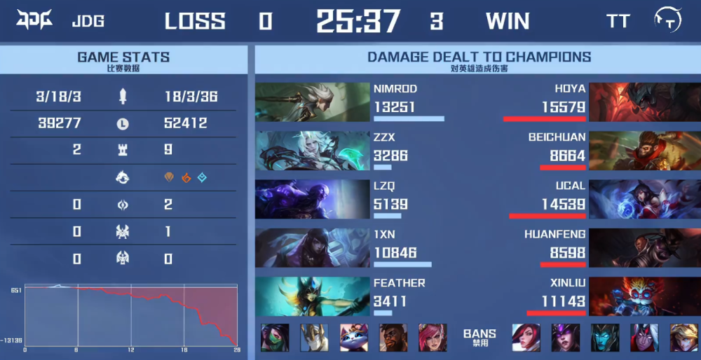 从这三局比赛的整体表现来看,TT能够击败JDG的原因非常明显,那就是TT的上中野选手完成了对JDG上中野选手的完美压制。第一局比赛,TT打野选手Beichuan打出了完美节奏,TT上中野很早就建立了非常大的优势,而TT在短短的25分钟左右就结束了比赛;第二局比赛,TT的中单Ucal凭借着瑞兹无解的发挥与Beichuan打出了完美的中野联动,TT轻松拿到赛点;而第三局比赛,则是TT上单选手Hoya上演了剑魔的“天神下凡”,几乎以一己之力带领着队友们拿下了比赛。值得一提的是,反倒是刚加盟TT不久的Huanfeng,或许是因为刚磨合,Huanfeng这个点的发挥就没有TT的上中野那么亮眼了。