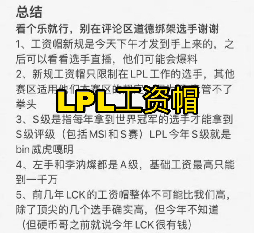 根据网友爆料今年lpl正式发布了工资帽的规定,只有拿到世界冠军或者MSI和冠军才能评到s级,而其他人员只能评为A级或者以下,基础薪资不能超过1000w,商务合同及其他类型的合约不受控制。如果消息属实,那么很多顶尖选手的薪资将会至少减少50%。而由于大环境因素,很多俱乐部也是都在亏本经营,这也使得俱乐部开始削减开支,这也造成了很多职业选手的失业,甚至很多厉害的职业选手找不到工作。