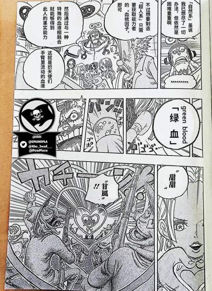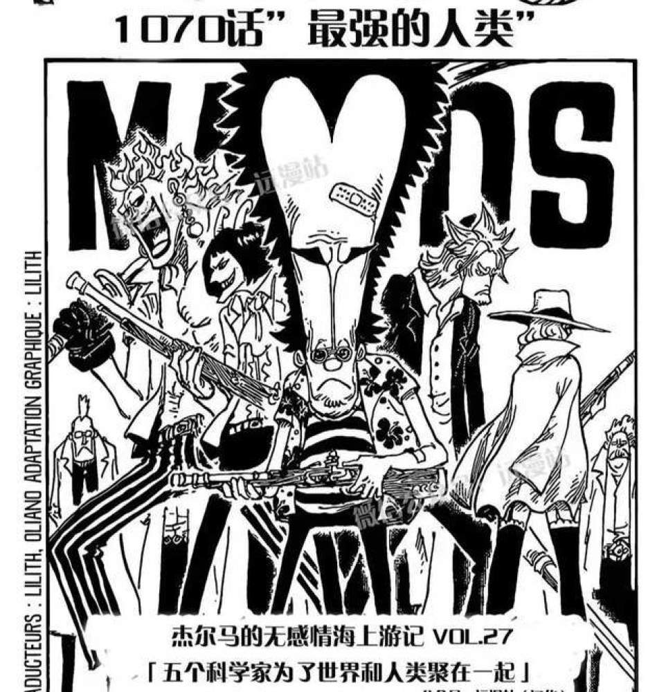 扉页小故事是五位科学家聚在一起,他们分别是贝加庞克,凯撒,疫灾奎因,伽治和一位神秘的女子。这些科学家非常年轻,应该是早年一起工作的时候,疫灾奎因根本看不出来,年轻时挺嚣张的,年老就变成大胖子。凯撒的黑发也很明显,头上还有两只角,贝加庞克的脑袋还不是很巨大。