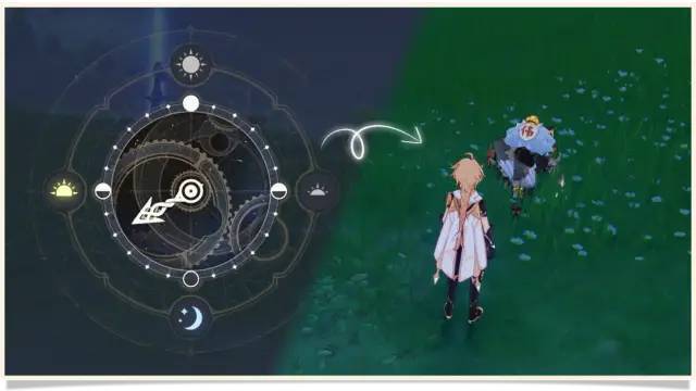 获得线索后,旅行者们需要在正确的时间段内到达该区域,找到并击退「奇怪的丘丘人」。旅行者们可以通过左上角「菜单」界面中的「时间」功能来调整时间段哦~