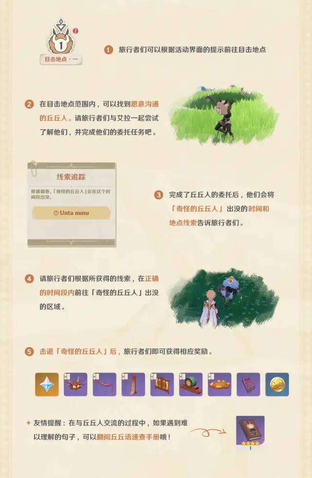 完成了丘丘人的委托后,他们会将「奇怪的丘丘人」出没的时间线索告诉旅行者,并帮忙在地图上标出「奇怪的丘丘人」出没的区域。