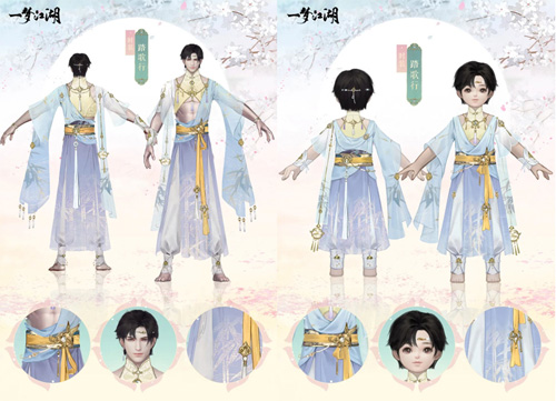 成男少侠身披蓝色纱衣,腹肌微露,清爽凉快~绘着祥云纹的金色立领搭配黄金项链,更显精致!小少侠们的碎发中露出嵌着珍珠的精致抹额,与腰间的飞燕衔珠遥相呼应,带来了大海的气息!