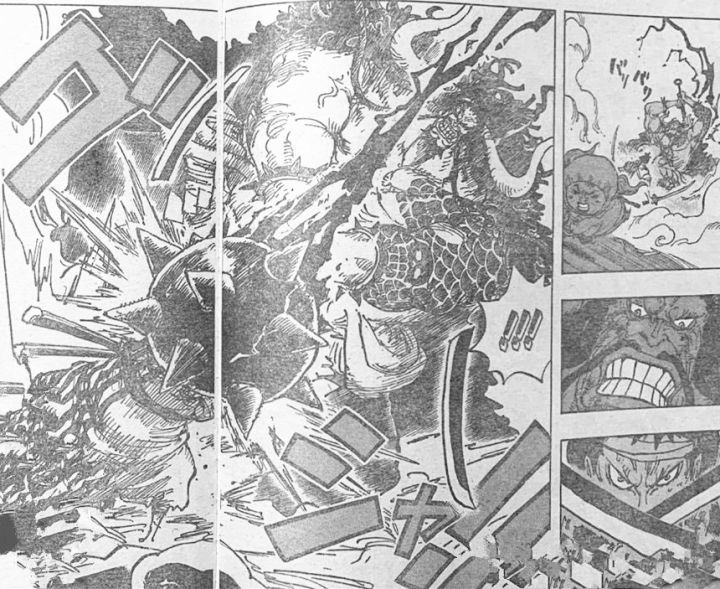 最后再来说下锦卫门,本话锦卫门结结实实地承受凯多一狼牙棒,而且还是带有霸王色拉丝的一棒,不少读者担心锦卫门会不会就这样下线了,以他和凯多的实力差距,这一击绝对活不来。