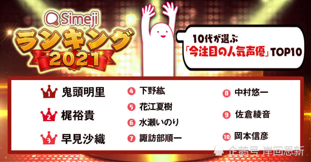近日,度娘株式会社(度娘日本)旗下的日语输入法Simeji,公布了一项调查结果,是关于“现在备受瞩目的人气声优TOP 10”排名榜,调查对象是日本10代用户(10岁到19岁),基本以00后为主,少部分是10后,大家大概了解一下调查对象是什么年龄范围就行了,还有度娘的日本分公司。